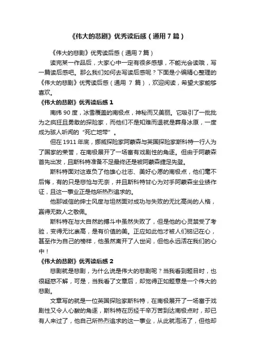 伟大的悲剧优秀读后感范文(精选41篇)伟大的悲剧优秀读后感篇1下午的语文课,我们学到《伟大的悲剧》一篇,课文讲述了斯科特一行人探索南极极点,最后却在返回途中死亡的故事。