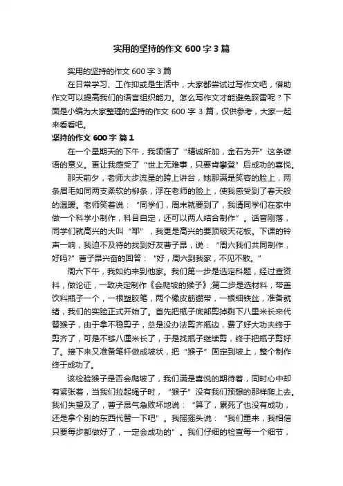 实用的坚持作文600字5篇实用的坚持作文600字5篇在平时的学习、工作或生活中,大家都尝试过写作文吧,作文是人们把记忆中所存储的有关知识、经验和思想用书面形式表达出来的记叙方式。