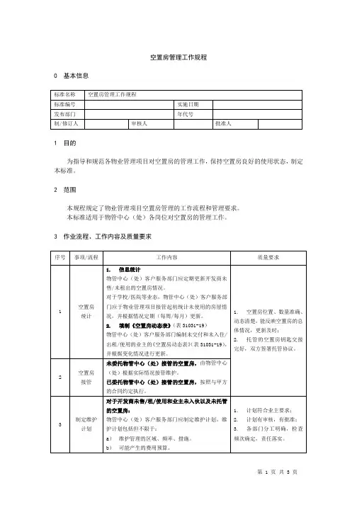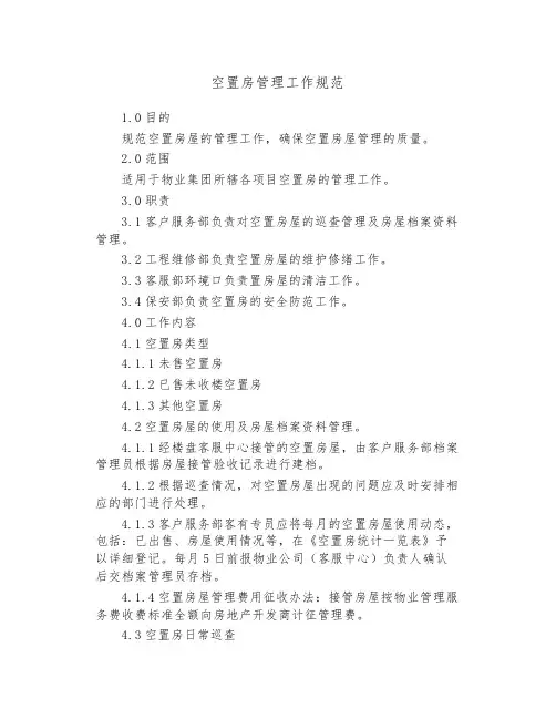 空置房管理工作规范1.0目的规范空置房屋的管理工作,确保空置房屋管理的质量。