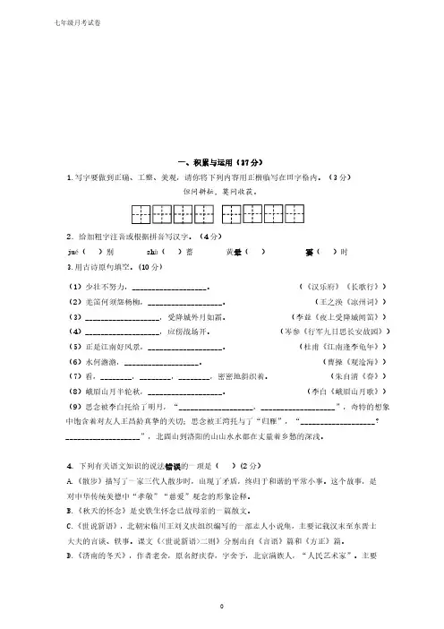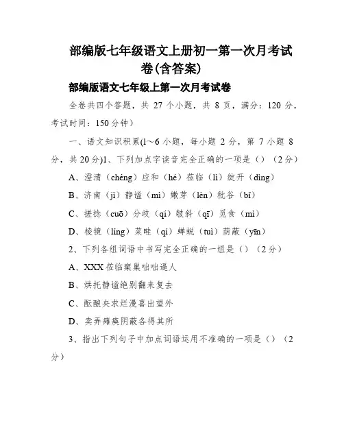 七年级第一学期语文第一次月考试卷(附答案)考生注意:1. 本试卷满分120 分,考试时间120 分钟。