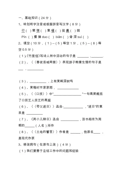 基础知识部分涵盖了字音、字形、词语、句子、标点符号等方面的知识点,旨在考察学生对语文基础知识的掌握程度。