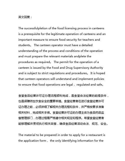 英文回复:The successfulpletion of the food licensing process in canteensis a prerequisite for the legitimate operation of canteens and an important measure to ensure food security for teachers and students。
