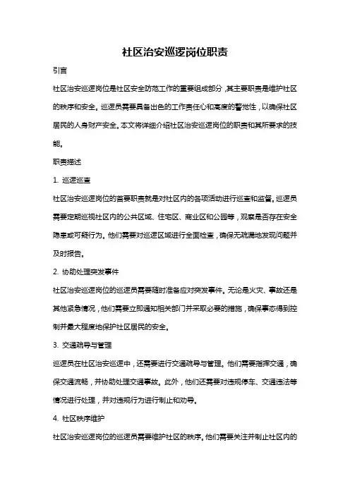 治安巡防员岗位职责治安巡防员是维护社会治安、保护人民安全的重要岗位,在社会稳定与安宁方面起着重要的作用。