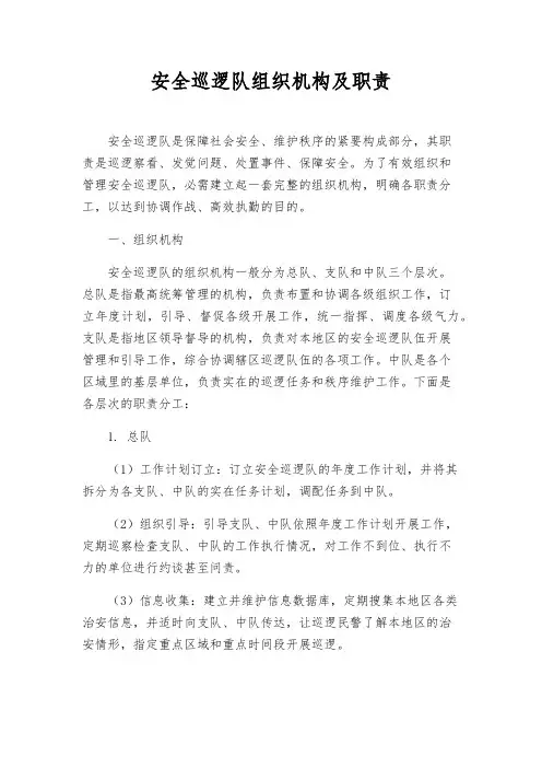 安全巡逻队组织机构及职责一、组织机构1.1 安全巡逻队的概念安全巡逻队是指负责小区、工地、商场等场所内部安全管理的专业队伍,其主要职责是负责巡逻、维护秩序、防控盗窃和应对突发事件等相关工作。