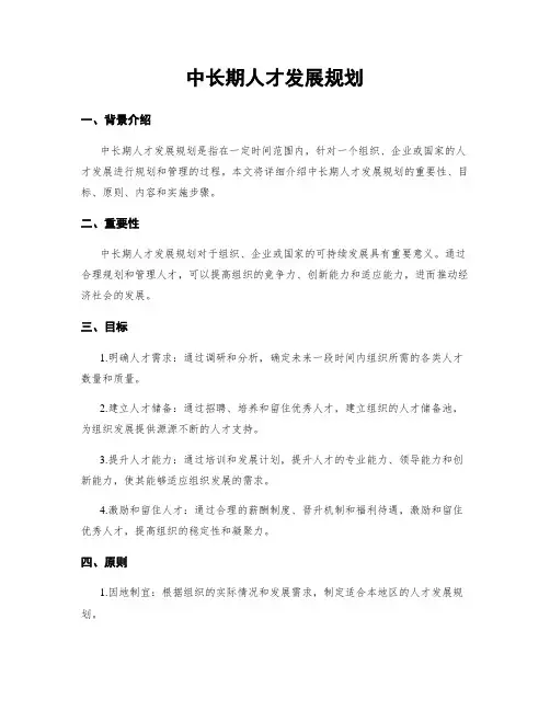 中长期人才发展规划一、背景介绍中长期人才发展规划是指在一定时间范围内,针对一个组织、企业或国家的人才发展进行规划和管理的过程。