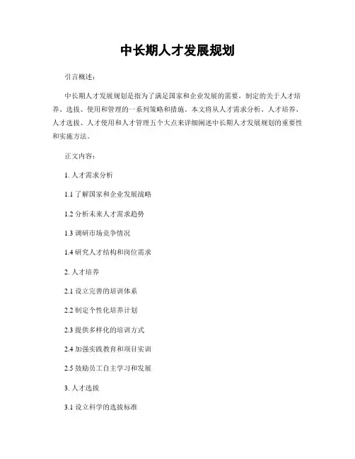 中长期人才发展规划标题:中长期人才发展规划引言概述:中长期人才发展规划是指为了满足国家经济社会发展需要,制定出一套系统的人才培养、引进、激励和流动机制,以保障人才队伍的稳定发展和可持续性。