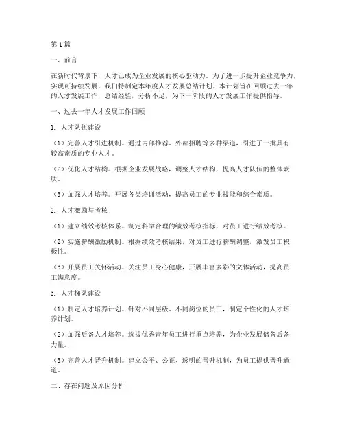 二、建立完善人才激励机制2.1 设立激励政策:制定出各种激励政策,包括薪酬福利、晋升机制、荣誉奖励等,以激励人才积极投入工作。