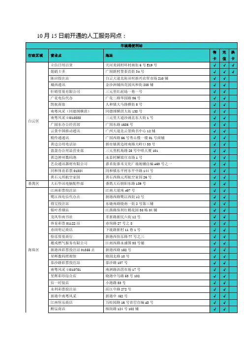 1.东圃营业厅中山大道中433号鸫银商业大厦101、102铺(东圃大马路北面)2.天河北路中信服务厅天河北路中信广场2楼213、216铺3.黄埔大道中营业厅天河区黄埔大道中219号粤韵庭苑首层104号商铺4.天河北芳草园营业厅广州市天河区天河北路579号之一东侧芳草园首层3号5.沙河龙洞营业厅沙河镇龙眼洞商业广场龙涛货仓商场二楼6.五山路服务厅华南农业大学茶山小区9-10号首层(五山邮政局旁)7.粤垦路服务厅粤垦路620号之一、之二、之三后部(金燕花园首层)8.广园东路服务厅广州市天河区广园东路金贵东街1号楼208-308号商铺(农业银行旁、金贵加油站对面)9.黄埔大道西广州市天河区黄埔大道西459号首层(国防大厦往西,芯连芯电子城西侧20米)10.龙口西路服务厅龙口西路1号天利广场首层西南部11.沙河服务厅先烈东路310-316号一处春大厦首层东北部12.体育西路服务厅体育西路57号广东省工商行政管理局综合楼首层北侧13.中山大道西棠下服务厅中山大道西491号棠下棠利大14.润粤服务厅天河路13号润粤大厦15.天星服务厅梅东路62号16.东湖西路服务厅东湖西路45-47号首层17.农林下路新裕营业厅农林下路81号新裕大厦首层大堂18.建设大马路营业厅建设大马路8号(逸雅居)103A铺19.中山三路服务厅中山三路121号首层20.文德路金德大厦服务厅文德路67—69号(金德大厦首层北铺)21.达道路金达大厦服务厅达道路12号金达大厦首层22.动感地带地王广场店较场西路18号地王广场负一层1038铺23.动感地带广东工业大学店广东工业大学本部北院学生宿舍4栋101房24.东风中路交易广场东风中路268号广东省信通信产品交易广场104/105铺25.大德路金艺大厦服务厅大德318号金艺大厦首层26.中山五路中旅中山五路219号中旅商业城110/111铺27.东风西路嘉和苑服务厅东风西路148号嘉和苑首层7-8号铺28.环市西营业厅环市西路151号首层(原市集邮公司)29.中山六路服务厅中山六路325号首层(回民饭店旁)30.北京路青年文化宫北京路312号青年文化宫南门二楼31.环市西路西湾西湾路80-86号羊城西湾大厦首层32.沿江西路西堤服务厅沿江西路43号市邮政集邮公司营业厅33.中山八路服务厅中山八路27号富力商贸大厦1号铺34.长寿西路文昌阁服务厅荔湾区长寿西路80号103铺35.新港西路服务厅海珠区新港西路235号愉景雅园首层西侧36.宝岗大道南北广场服务厅宝岗大道南北广场首层09、10号铺37.江南大道中营业厅广州市江南大道中153号中联数码科技广场A004、005铺38.新港中路赤岗服务厅新港中路535号117、118铺39.工业大道中营业厅工业大道中385号(保利百合花园前行50米)40.江南大道南保华商城服务厅江南大道南362号保华商城首层41.晓港湾服务厅南洲路北晓港湾英华街65-67号惠侨苑首层19、20号铺位42.新港西路中大服务厅新港西路146号顺华名庭首层43.江南西江南花园服务厅宝业路8号(江南西路与宝岗大道交界处西侧)44.动感地带中山大学店中山大学东北区346栋首层西侧45.广园中路服务厅广州市白云区广园中路203-207号河北大厦首层46.同德围服务厅西槎路同雅苑同雅街10号47.江高服务厅广州市白云区江高镇江同路149号美华商场首层(即江村工行侧)48.钟落潭服务厅广州市白云区钟落潭镇福龙路桥东北侧34号49.太和服务厅太和镇和乐路珊景新村和乐楼98、100号50.解放北路金桂服务厅解放北路1416号金桂园云华阁首层51.人和镇服务厅人和镇人和大马路兴达大厦北面3-4号52.新市服务厅机场路1003号(原广花五路厅)53.同和中服务厅广州大道北1421号圣地大厦首层102-11~1754.石井镇服务厅石井镇石潭路90号商铺55.神山服务厅神山镇神山大道西63号首层56.增槎路螺涌围服务厅增槎路12号(螺涌围)首层104铺57.龙归服务厅龙归镇兴龙路龙华花园首层北侧59.良田服务厅良田镇良城三路1~3号60.嘉禾服务厅旧广花路嘉禾路段望江村嘉禾街社区服务中心北侧自编1号61.芳村大道中服务厅芳村大道中242号首层62.黄埔大沙东服务厅黄埔大沙东路3号首层西侧商铺63.开发区青年路服务厅开发区青年路124、126号64.萝岗镇服务厅萝岗镇萝岗圩荔红路2号。