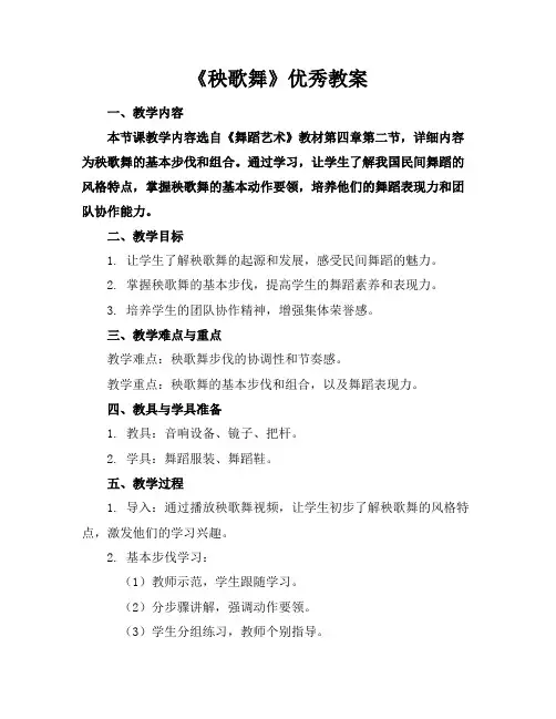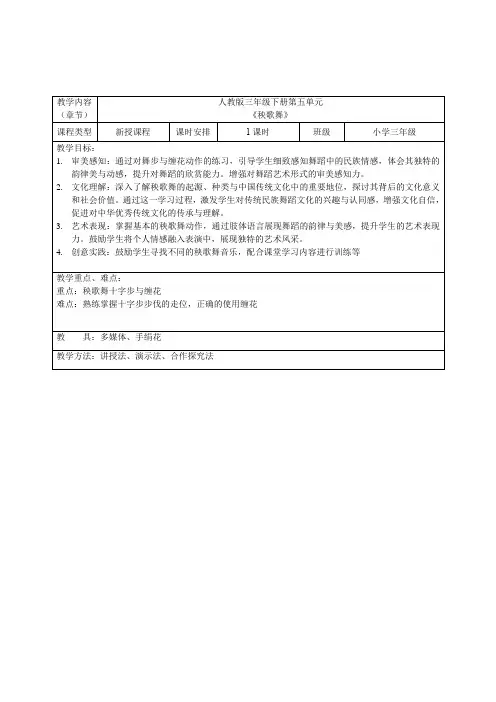 五、教学过程1.导入(5分钟)教师向学生介绍秧歌舞的由来和特点,让学生通过画面、视频等形式感受秧歌的热闹气氛,激发学生学习秧歌舞的兴趣。