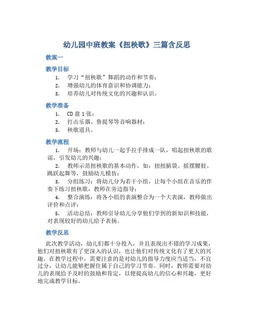 三、活动准备:录音机、磁带、彩带,秧歌舞碟片四、活动过程:(一)、欣赏《秧歌舞》,引起幼儿兴趣1、小朋友们你们跳过秧歌舞吗?(请幼儿欣赏)2、你看到里面的人是怎么跳舞的?他们做了哪些动作?(扭来扭去很高兴的样子)(二)、倾听音乐两遍,幼儿联想1、这首歌听了以后,感觉怎么样?(欢快、高兴等)2、你听到了歌曲里唱了些什么?3、你会给这首歌加上好看的动作呢?(三)、教舞蹈《扭秧歌》1、欣赏老师完整跳一遍。