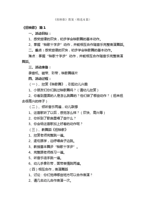 《扭秧歌》教案(精选6篇)《扭秧歌》篇1一、活动目标:1、感受旋律的欢快,初步学会秧歌舞的基本动作。