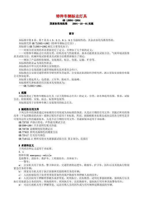 特种车辆标志灯具GB 13954-2004国家标准局批准 2004-10-01实施前言本标准中第5章、第7章及4.3、8.2、9.1、9.2为强制性的,其余内容均为推荐性的。
