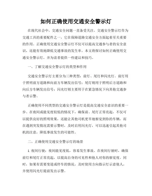 三、正确操作交通安全警示灯的技巧1. 准确使用方向指示灯:在变更车道、转弯或并线时,准确使用方向指示灯是非常重要的。