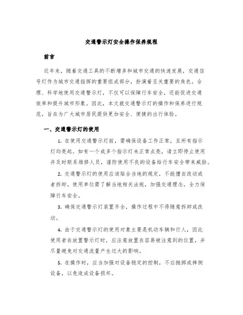 交通警示灯安全操作保养规程前言近年来,随着交通工具的不断增多和城市交通的快速发展,交通信号灯作为城市交通指挥的重要组成部分,扮演着至关重要的角色。