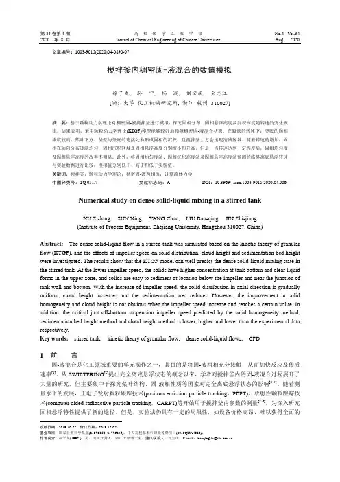 关键词:搅拌釜;颗粒动力学理论;稠密固-液两相流;计算流体力学中图分类号:TQ 051.7 文献标志码:A DOI:10.3969/j.issn.1003-9015.2020.04.006 Numerical study on dense solid-liquid mixing in a stirred tankXU Zi-long, SUN Ning, YANG Chao, LIU Bao-qing, JIN Zhi-jiang(Institute of Process Equipment, Zhejiang University, Hangzhou 310027, China)Abstract: The dense solid-liquid flow in a stirred tank was simulated based on the kinetic theory of granular flow (KTGF), and the effects of impeller speed on solid distribution, cloud height and sedimentation bed height were investigated. The results show that the KTGF model can well predict the dense solid-liquid mixing state in the stirred tank. At the lower impeller speed, the solids have higher concentration at tank bottom and clear liquid forms in the upper zone, and solids are easy to sediment at location below the impeller and near the junction of tank wall and bottom. With the increase of impeller speed, the solid distribution in axial direction is gradually uniform, cloud height increases and the sedimentation area reduces. However, the improvement in solid homogeneity and cloud height is not obvious when the impeller speed increase and reaches a certain value. In addition, the critical just off-bottom suspension impeller speed predicted by the solid homogeneity method, sedimentation bed height method and cloud height method is lower, higher and lower than the experimental data, respectively.Key words: stirred tank; kinetic theory of granular flow; dense solid-liquid flows; CFD1前言固-液混合是化工领域重要的单元操作之一,其目的是将固-液两相充分接触,从而加快反应及传质速率[1]。