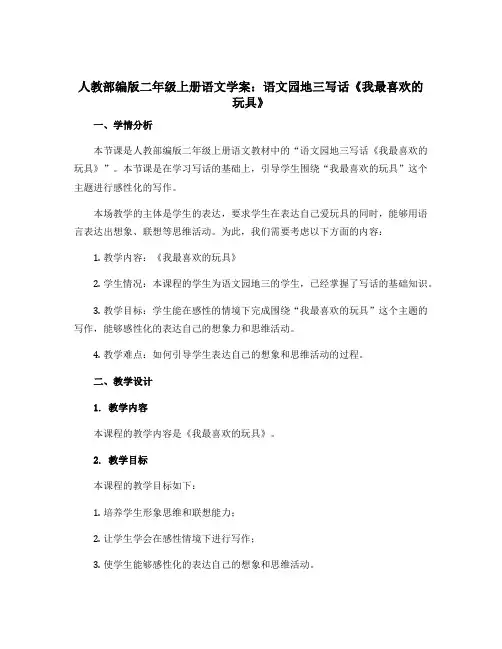 人教部编版二年级上册语文学案:语文园地三写话《我最喜欢的玩具》一、学情分析本节课是人教部编版二年级上册语文教材中的“语文园地三写话《我最喜欢的玩具》”。