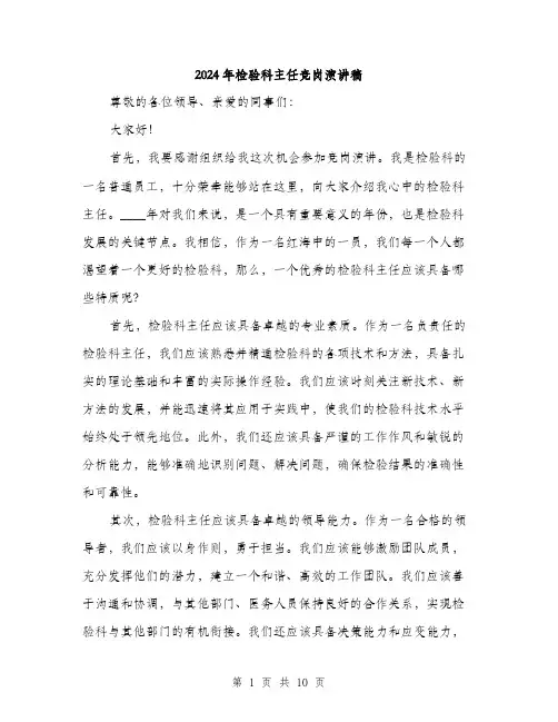 2024年医院检验科主任职位竞聘演讲稿尊敬的评委、亲爱的各位领导、亲爱的同事们:大家好!我是XX医院检验科的一名员工,非常荣幸能够站在这里,向大家竞聘____年医院检验科主任的职位。