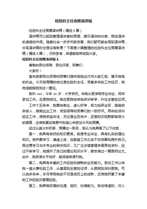 在不断进步的时代,越来越多人会去使用演讲稿,写起演讲稿来就毫无头绪?下面是小编为大家整理的检验科主任的竞聘演讲稿,希望能够帮助到大家!检验科主任的竞聘演讲稿1尊敬的各位领导、评委、同志们:你们好!首先感谢____给我提供了这次竞争上岗的机会。