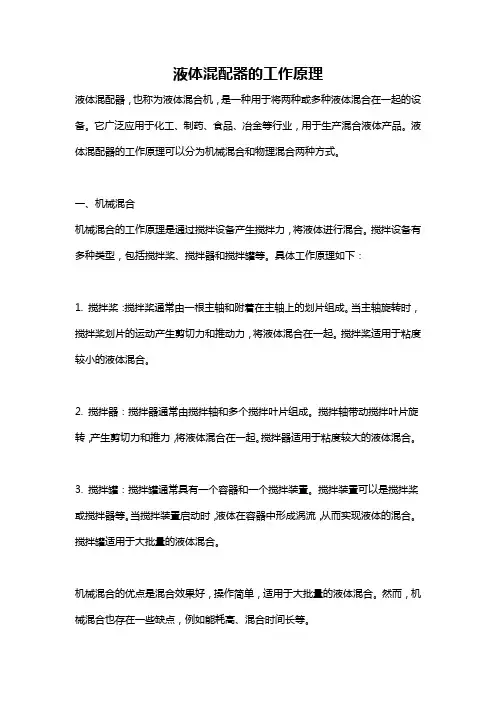 一、机械混合机械混合的工作原理是通过搅拌设备产生搅拌力,将液体进行混合。