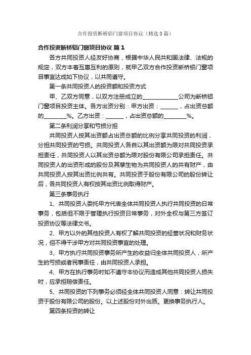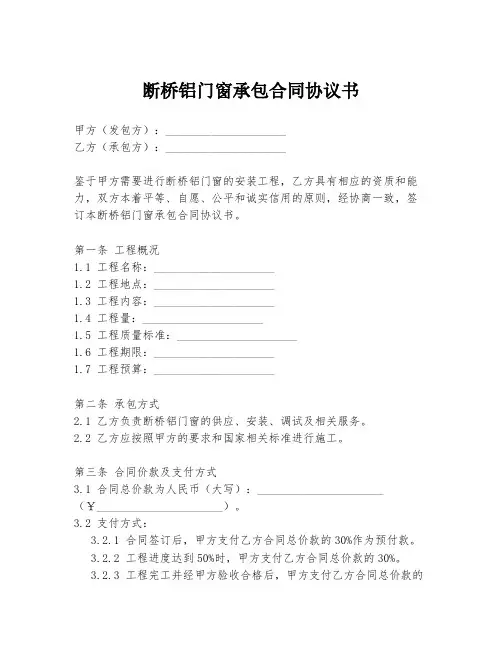第一条工程概况1.1 工程名称:_____________________1.2 工程地点:_____________________1.3 工程内容:_____________________1.4 工程量:_____________________1.5 工程质量标准:_____________________1.6 工程期限:_____________________1.7 工程预算:_____________________第二条承包方式2.1 乙方负责断桥铝门窗的供应、安装、调试及相关服务。