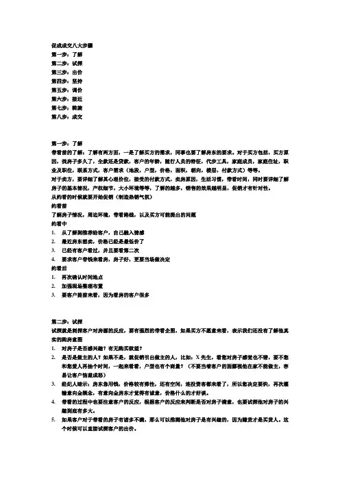 促成成交八大步骤第一步:了解第二步:试探第三步:出价第四步:坚持第五步:调价第六步:接近第七步:斡旋第八步:成交第一步:了解带看前的了解:了解有两方面,一是了解买方的需求,同事也要了解房东的要求。