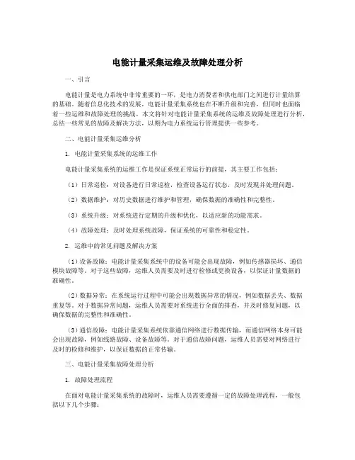 一、故障分析1. 电能计量装置的元件故障电能计量装置包括电能表、电流互感器、电压互感器等多个元件,这些元件的故障可能导致电能计量数据异常,进而影响系统的运行。
