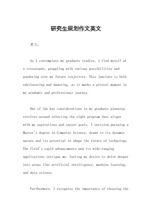 研究生规划作文英文英文:As I contemplate my graduate studies, I find myself at a crossroads, grappling with various possibilities and pondering over my future trajectory. This juncture is both exhilarating and daunting, as it marks a pivotal moment in my academic and professional journey.One of the key considerations in my graduate planning revolves around selecting the right program that aligns with my aspirations and career goals. I envision pursuing a Master's degree in Computer Science, drawn to its dynamic nature and its potential to shape the future of technology. The field's rapid advancements and its wide-ranging applications intrigue me, fueling my desire to delve deeper into areas like artificial intelligence, machine learning, and data science.Furthermore, I recognize the importance of choosing theright institution that offers a conducive environment for academic growth and fosters a vibrant community of scholars. For instance, universities renowned for their cutting-edge research facilities and collaborative ethos, such as Stanford and MIT, stand out as top contenders on my list. Their rich academic offerings and diverse student body promise an enriching learning experience, where I can interact with like-minded peers and esteemed faculty members.Another crucial aspect of my graduate planning involves exploring opportunities beyond the confines of the classroom. I aim to engage in internships, research projects, and networking events to augment my theoretical knowledge with practical insights and real-world experience. By immersing myself in hands-on projects and collaborating with industry professionals, I aim to bridge the gap between theory and practice, preparing myself for the challenges and opportunities that lie ahead in my career.Moreover, I recognize the significance of personal and professional development during my graduate studies. Beyondacademic pursuits, I intend to cultivate essential skills such as critical thinking, communication, and leadership. Engaging in extracurricular activities, volunteering initiatives, and mentorship programs will enable me to hone these skills and expand my horizons, equipping me with the tools necessary to thrive in a competitive job market.In essence, my graduate planning involves a holistic approach that encompasses academic excellence, practical experience, and personal growth. By carefully navigating these considerations and seizing opportunities along the way, I aim to chart a fulfilling and impactful path in my chosen field.中文:在我思考我的研究生学习时,我发现自己面临着一个十字路口,思考着各种可能性,思索着我的未来方向。