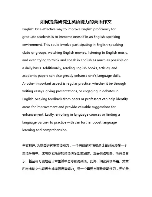 如何提高研究生英语能力的英语作文English: One effective way to improve English proficiency for graduate students is to immerse oneself in an English-speaking environment. This could involve participating in English-speaking clubs or groups, watching English movies, listening to English music, and even trying to think and speak in English as much as possible on a daily basis. Additionally, reading English books, articles, and academic papers can also greatly enhance one's language skills. Another important aspect is regular practice, whether it be through writing essays, giving presentations, or engaging in debates in English. Seeking feedback from peers or professors can help identify areas for improvement and provide valuable suggestions for enhancement. Lastly, enrolling in language courses or finding a language partner to practice with can further boost language learning and comprehension.中文翻译: 为提高研究生英语能力,一个有效的方法就是让自己沉浸在一个英语环境中。