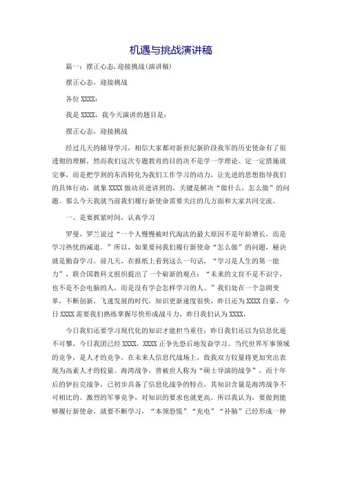 机遇与挑战演讲稿篇一:摆正心态,迎接挑战(演讲稿)摆正心态,迎接挑战各位XXXX:我是XXXX,我今天演讲的题目是:摆正心态,迎接挑战经过几天的辅导学习,相信大家都对新世纪新阶段我军的历史使命有了很透彻的理解,然而我们这次专题教育的目的决不是学一学理论、定一定措施就完事,而是把学到的东西转化为我们工作学习的动力,让先进的思想指导我们的具体行动,就象XXXX做动员进讲到的,关键是解决“做什么,怎么做”的问题。