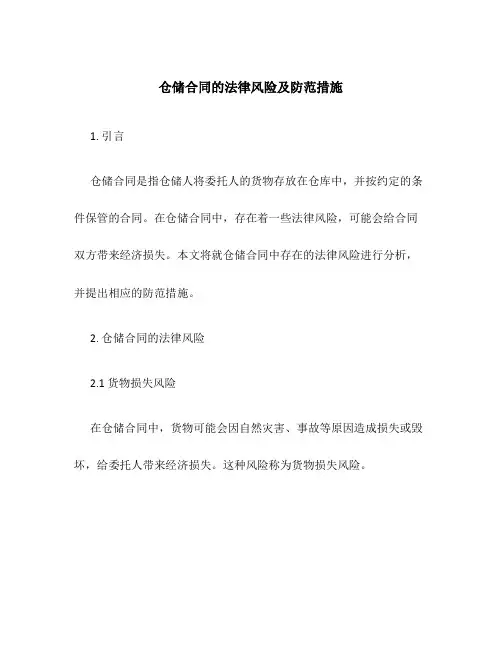 仓储合同的法律风险及防范措施1. 引言仓储合同是指仓储人将委托人的货物存放在仓库中,并按约定的条件保管的合同。