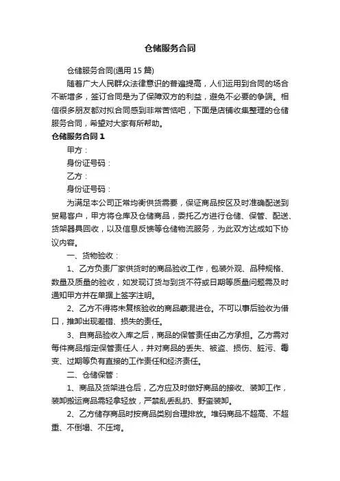 仓储服务合同仓储服务合同(通用15篇)随着广大人民群众法律意识的普遍提高,人们运用到合同的场合不断增多,签订合同是为了保障双方的利益,避免不必要的争端。