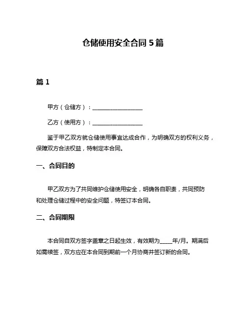 仓储使用安全合同5篇篇1甲方(仓储方):____________________乙方(使用方):____________________鉴于甲乙双方就仓储使用事宜达成合作,为明确双方的权利义务,保障双方合法权益,特制定本合同。