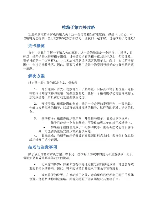 技巧与注意事项除了以上的基本解决方案,以下是一些推箱子游戏中的技巧和注意事项,可以帮助你更有效地解决第六关的挑战:•记录你的步骤:如果你没有很好地记住之前的移动步骤,可能会导致混乱和错误的移动。