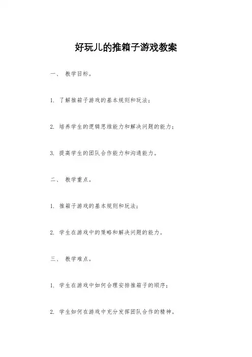 1. 了解推箱子游戏的基本规则和玩法;2. 培养学生的逻辑思维能力和解决问题的能力;3. 提高学生的团队合作能力和沟通能力。