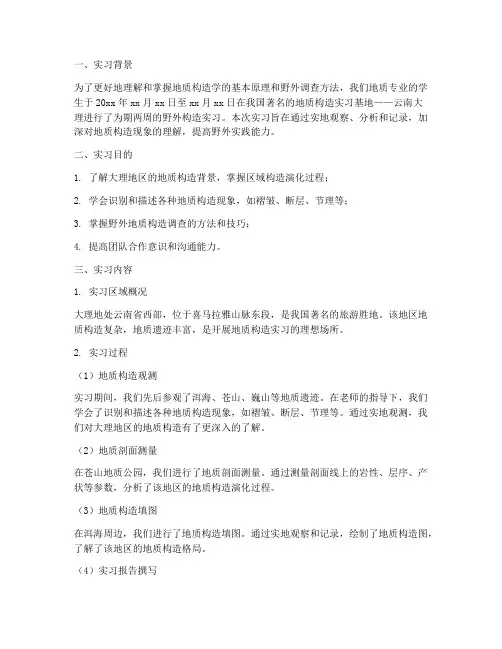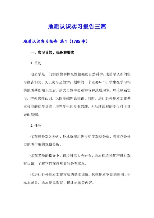 二、实习目的1. 学习地质学的基本理论知识和研究方法;2. 了解地质学在实际工作中的应用;3. 提高地质实地调查和样品采集技能;4. 提升数据处理和实验技术。