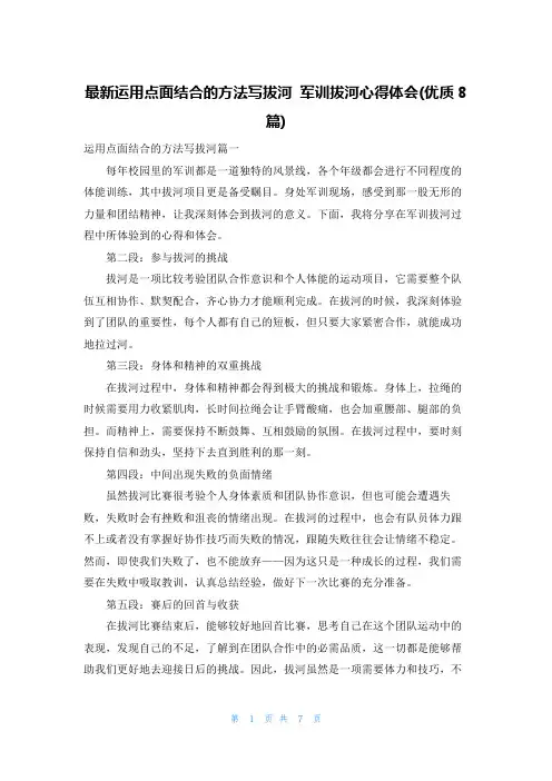 最新运用点面结合的方法写拔河军训拔河心得体会(优质8篇)运用点面结合的方法写拔河篇一每年校园里的军训都是一道独特的风景线,各个年级都会进行不同程度的体能训练,其中拔河项目更是备受瞩目。