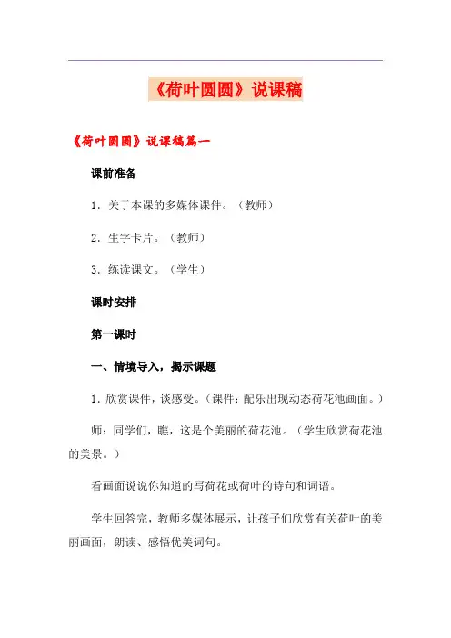 2023年《荷叶圆圆》说课稿(15篇)《荷叶圆圆》说课稿1一、说教材《荷叶圆圆》是部编版小学语文一年级下册第六单元第13课。