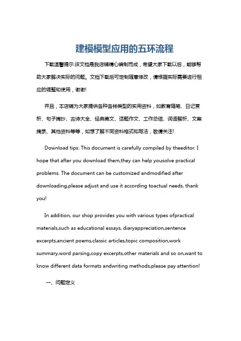 文档下载后可定制随意修改,请根据实际需要进行相应的调整和使用,谢谢!并且,本店铺为大家提供各种各样类型的实用资料,如教育随笔、日记赏析、句子摘抄、古诗大全、经典美文、话题作文、工作总结、词语解析、文案摘录、其他资料等等,如想了解不同资料格式和写法,敬请关注!Download tips: This document is carefully compiled by theeditor. I hope that after you download them,they can help yousolve practical problems. The document can be customized andmodified after downloading,please adjust and use it according toactual needs, thank you!In addition, our shop provides you with various types ofpractical materials,such as educational essays, diaryappreciation,sentence excerpts,ancient poems,classic articles,topic composition,work summary,word parsing,copy excerpts,other materials and so on,want to know different data formats andwriting methods,please pay attention!数据建模模型应用的五环流程通常包括以下五个步骤:1. 业务理解明确业务问题和目标:与业务团队合作,了解他们面临的挑战和需要解决的问题。