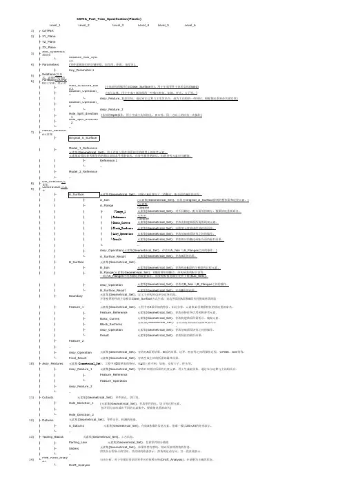 上海闰奕科技有限公司RYSAT TECHNOLOGY CO.LTDCATIA V5通用建模规范编制:聂永日期2015.1.30审核:日期批准:日期目录1 CATIA的数据规范....................................................... - 3 -1.1 CATIA零部件的数据规范........................................... - 3 -1.1.1 CATIA零部件目录树的规范性................................. - 3 -1.1.1.1 典型塑料件类零件目录树............................... - 3 -1.1.1.2钣金件类零件目录树................................... - 9 -1.1.1.3 CATIA部件目录树.................................... - 12 -1.1.2 CATIA零部件的有效性...................................... - 13 -1.1.3 CATIA零部件属性的规范性.................................. - 14 -1.2工程图(Drawing)的数据管理....................................... - 14 - 2针对零件特点的建模标准................................................ - 14 -2.1 塑料件的建模标准................................................ - 14 -2.1.1 建模思路.................................................. - 15 -2.1.2 基本建模步骤.............................................. - 15 -2.1.3 注意事项.................................................. - 17 -2.2 钣金件的建模标准................................................ - 17 -3 CATIA建模要求........................................................ - 18 -3.1 CATIA建模的一般要求............................................ - 18 -3.1.1 CATIA建模的一般原则...................................... - 18 -3.1.2 几何图形的表达........................................... - 19 -3.1.2.1 几何图形的简化..................................... - 19 -3.1.2.2 零件比例........................................... - 19 -3.1.2.3 自身对称的零件:................................... - 19 -3.1.2.4 左、右对称的零件................................... - 19 -3.1.2.5 几何元素的使用和图形表达........................... - 19 -3.2 CATIA三维模型的建模要求........................................ - 19 -3.2.1带有装配变形零部件的建模要求.............................. - 19 -3.2.1.1 非金属变形零件...................................... - 19 -3.2.1.2金属变形零件........................................ - 20 -3.2.2 标准件的使用要求.......................................... - 20 -3.2.3 参考元素的使用和表达..................................... - 20 -3.2.4 有运动机构的部件.......................................... - 20 -为提高CATIA数据元素的有效性,方便数据的查找管理,提高工程建模的效率,增强数据的可读性和可修改性,建立公司内部CATIA的建模规范。