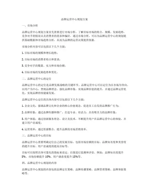 品牌运营中心规划方案一、市场分析品牌运营中心规划方案首先需要进行市场分析,了解目标市场的特点、规模、发展趋势,竞争对手的情况以及消费者的需求和偏好。