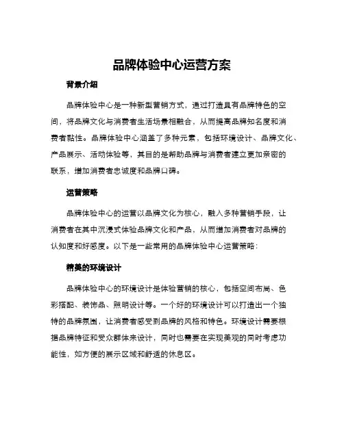 品牌体验中心运营方案背景介绍品牌体验中心是一种新型营销方式,通过打造具有品牌特色的空间,将品牌文化与消费者生活场景相融合,从而提高品牌知名度和消费者黏性。