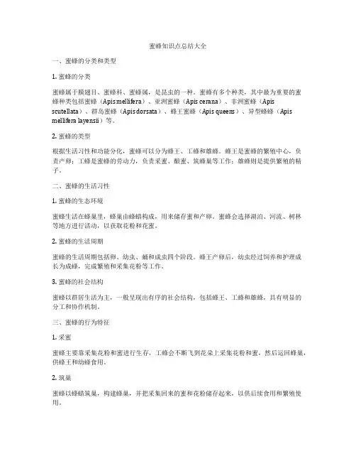 蜜蜂知识点总结大全一、蜜蜂的分类和类型1. 蜜蜂的分类蜜蜂属于膜翅目、蜜蜂科、蜜蜂属,是昆虫的一种。