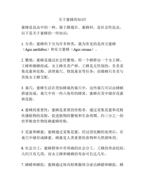 蜜蜂的知识蜜蜂的知识蜜蜂的知识一蜜蜂的认识首先想要了解蜜蜂的知识,就要让我们先来了解蜜蜂。