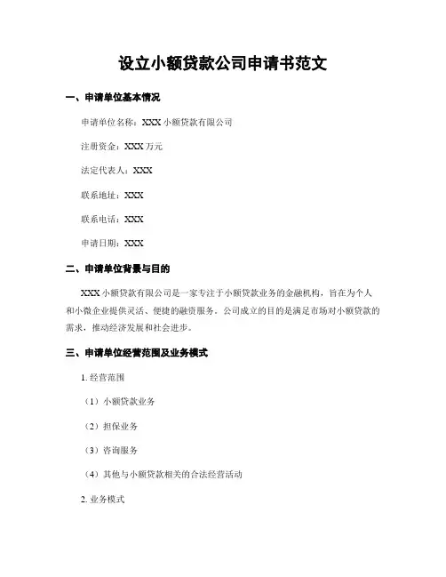 设立小额贷款公司申请书范文一、申请单位基本情况申请单位名称:XXX小额贷款有限公司注册资金:XXX万元法定代表人:XXX联系地址:XXX联系电话:XXX申请日期:XXX二、申请单位背景与目的XXX小额贷款有限公司是一家专注于小额贷款业务的金融机构,旨在为个人和小微企业提供灵活、便捷的融资服务。