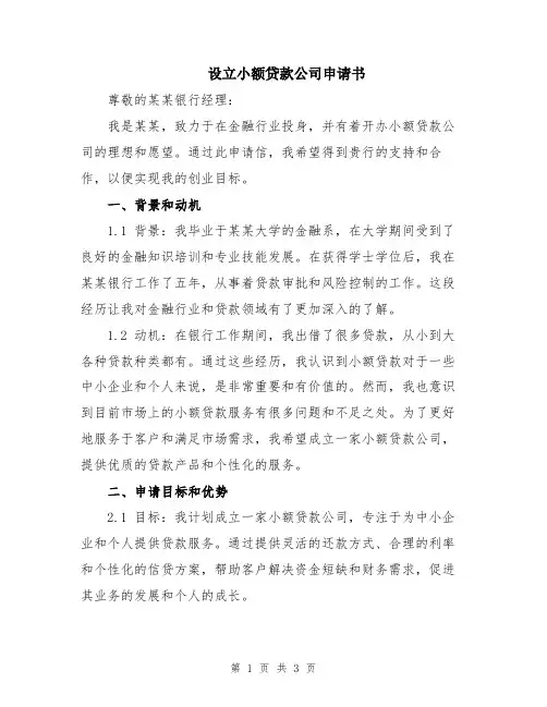 二、申请目标和优势2.1 目标:我计划成立一家小额贷款公司,专注于为中小企业和个人提供贷款服务。