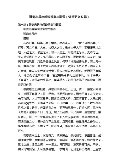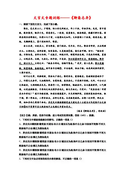 8.对下列句子中加点词的解释,不正确的一项是( )A. 文章词赋,冠绝当时绝:超过B. 无何寝疾,公遗问不绝遗:遗留C. 公适以忤上官免忤:冒犯D. 疾革难遽瘥,请先发瘥:病愈9.下列各组句子中,加点词的意义和用法相同的—组是( )A.辞而.归,杜门不出荆轲和而.歌,为变徵之声B.生以.生平所拟举业悉录授读使者大喜,女口惠语以.让单于C.而所遇不偶,困于.名场虽才高于.世,而无骄尚之情D.足下朝至,则.仆夕发矣险以远,则.至者少10.下列对原文有关内容的分析和概括,不正确的—项是( )A.叶生的文章名冠—时,但时运不济,科举考试屡试不中,丁乘鹤见到他的文章大加赞赏,时常给些钱粮让他养家。