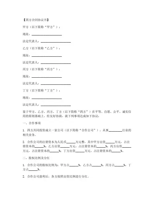 【四方合同协议书】甲方(以下简称“甲方”):地址:____________________法定代表人:____________________乙方(以下简称“乙方”):地址:____________________法定代表人:____________________丙方(以下简称“丙方”):地址:____________________法定代表人:____________________丁方(以下简称“丁方”):地址:____________________法定代表人:____________________鉴于甲方、乙方、丙方、丁方(以下简称“四方”)在平等、自愿、公平、诚实信用的原则基础上,经友好协商,就下列事项达成如下协议:一、合作事项1. 四方共同投资成立一家公司(以下简称“合作公司”),从事_________行业的相关业务。