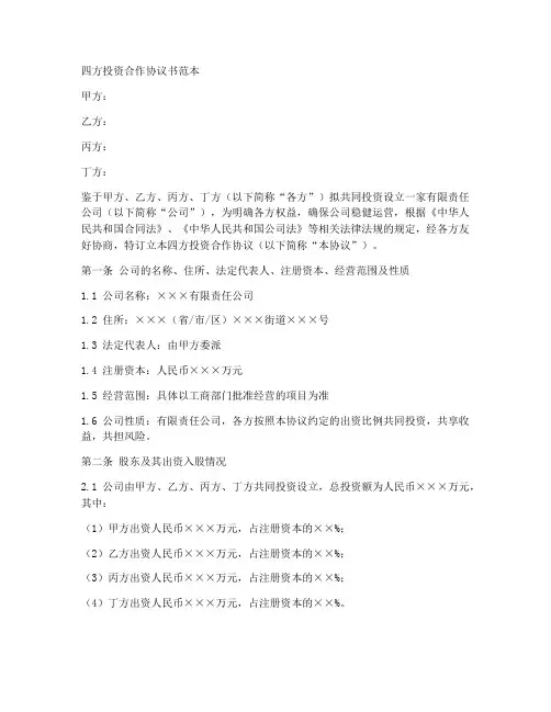 第二条出资与股权分配1. 四方共同出资金额为XXX万元,分别为甲方出资XXX万元,乙方出资XXX万元,丙方出资XXX万元,丁方出资XXX万元。