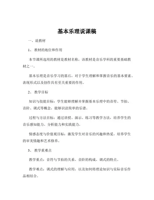 一、教材分析《基本乐理》是音乐学习的基础课程,对于学生理解音乐语言、掌握音乐表现手段具有重要意义。