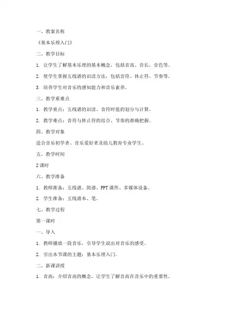 一、教案名称《基本乐理入门》二、教学目标1. 让学生了解基本乐理的基本概念,包括音高、音长、音色等。